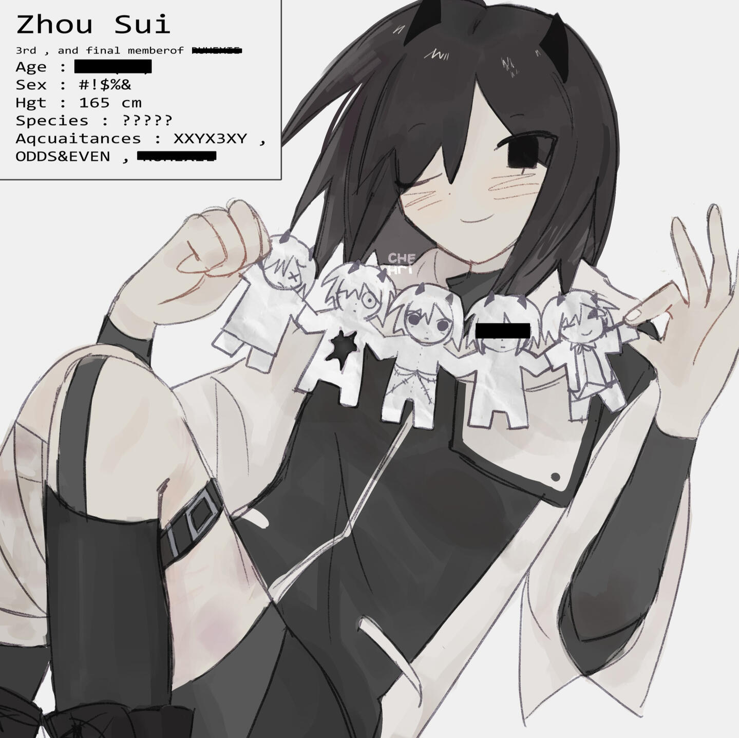 "Sui is rather.... an odd case, they haven't really discussed their condition at all, but they have been experiencing manic states more often now. Sui is also rather distant and not very open about their past, even to 3XY, not sure if they have any family..? they're probably hiding something. We aren't even sure of where Sui came from, I guess she just appeared. Sui is most likely from the underworld, at least that's what I think."